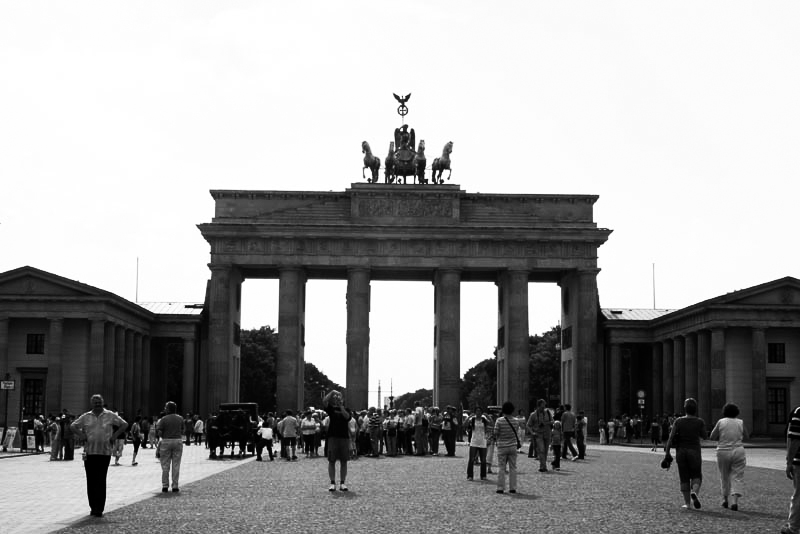 Proseguendo verso ovest e percorrendo il lungo viale Unter den Linden (ovvero Sotto i tigli) si arriva al simbolo di Berlino, la Porta di Brandeburgo, dove termina il quartiere Mitte ed inizia il Tiergarten. Al tempo del DDR la Porta rappresentava il limite della Berlino dell’est, e subito dietro alla porta correva il Muro che divideva in due la città. Oggi qui il muro è stato completamente abbattuto ma rimane sull’asfalto la traccia di dove correva, altra cicatrice profonda che Berlino ha scelto di mostrare.