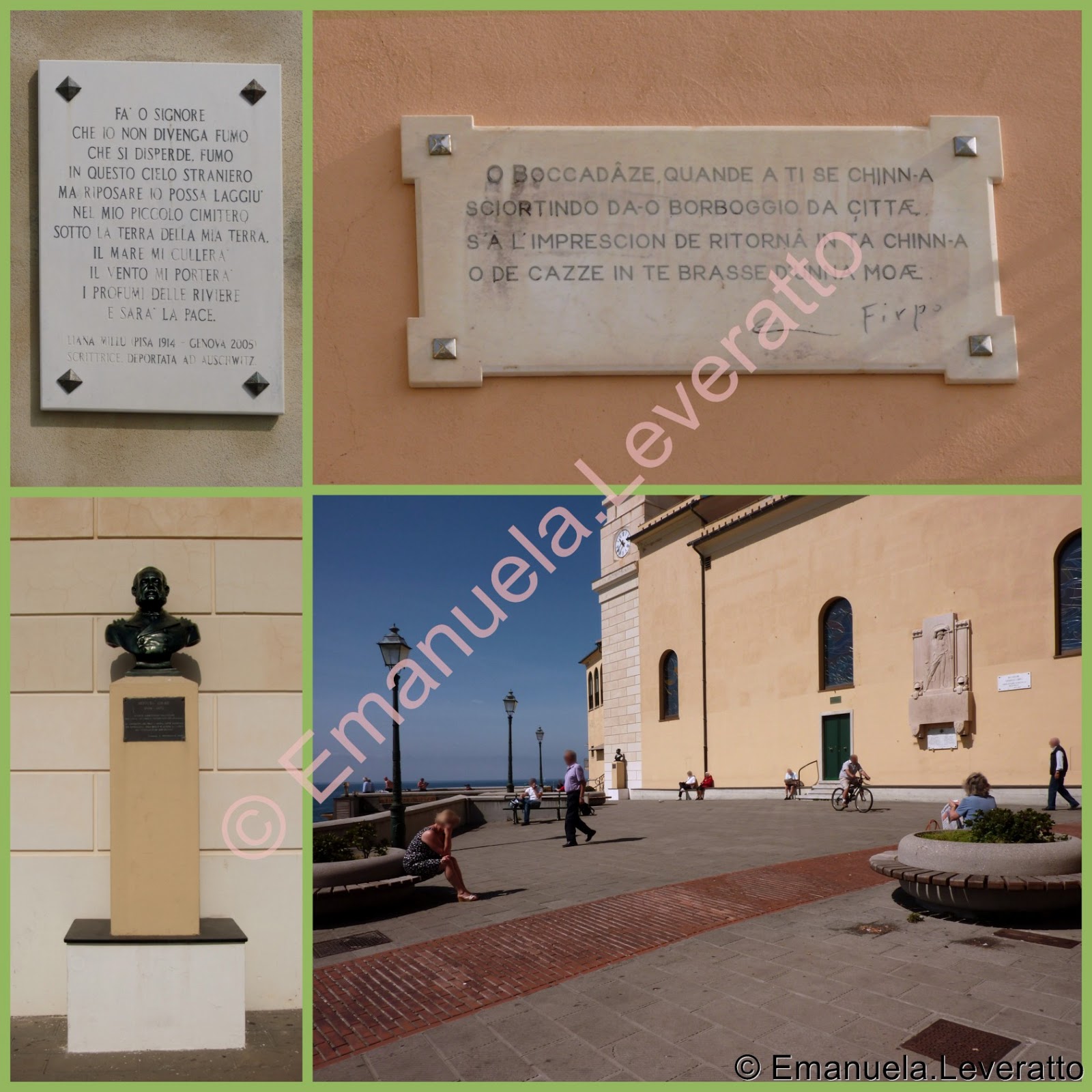 Scrisse anche una poesia dedicata al borgo che recita “Oh Boccadasse quando a te si scende uscendo dal rumore della città si ha l’impressione di ritornare nella culla o di cadere nelle braccia di una madre” (purtroppo nella traduzione si perde la musicalità dei versi). Sotto alla scalinata che conduce al paese invece c’è la targa dedicata a Liana Millu, una scrittrice italiana che combatté durante la Resistenza. Infine la statua di Miguel Grau, ammiraglio ed eroe nazionale peruviano al quale la Repubblica peruviana dedicò questo piccolo monumento nel 2005 perché Boccadasse ricorda molto i borghi di pescatori di Piura che era la sua città natale.