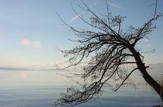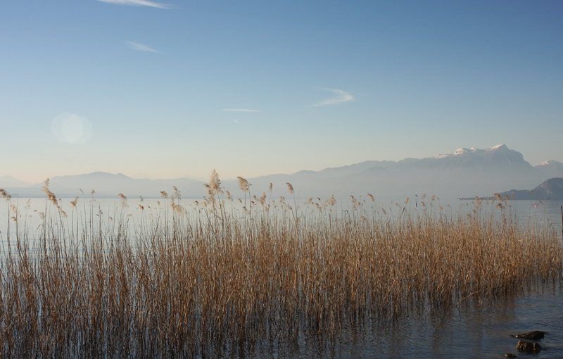Ben presto il marciapiede asfaltato lascia spazio a una via di ghiaino che passa a pochi passi dalla riva, tra alberi piegati che sembrano voler inchinarsi di fronte alla bellezza del lago e giunchi che oscillano al vento. E’ bello fare questa passeggiata in diversi momenti della giornata per osservare il lago cambiare colore al variare della luce, passando da un azzurro intenso a toni che sfumano nel viola.