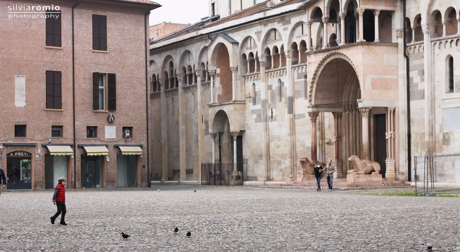 Con il naso all’insù le giro intorno e d’improvviso lo spazio raccolto di Piazza della Torre fluisce nel mare di Piazza Grande, il salotto cittadino, che stranamente si sviluppa dietro alla Cattedrale, quasi volesse defilarsi per restare dietro le quinte. Un lato è bordato da una fila di archi che paiono rincorrersi e inciampano nella Torre dell’Orologio, e su in alto la statua dellaBonissima a mani giunte veglia sui modenesi: 800 anni e non li mostra, la leggenda vuole essere colei che sfamò il popolo in carestia.