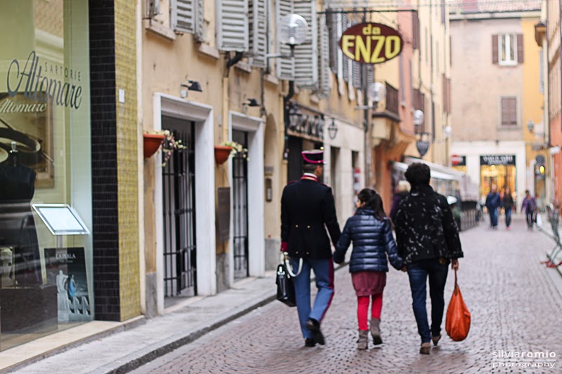 Proseguo lungo stradine bordate di case multicolore dipinte di caldi colori autunnali e tra la gente che passeggia senza fretta scorgo tanti ufficiali. Non ci avevo pensato ma a Modena c’è l’accademia Militare e il sabato le vie del centro si riempiono di cadetti fasciati nelle loro eleganti divise blu, intenti a godersi qualche ora di libera uscita accompagnati da graziose fanciulle.