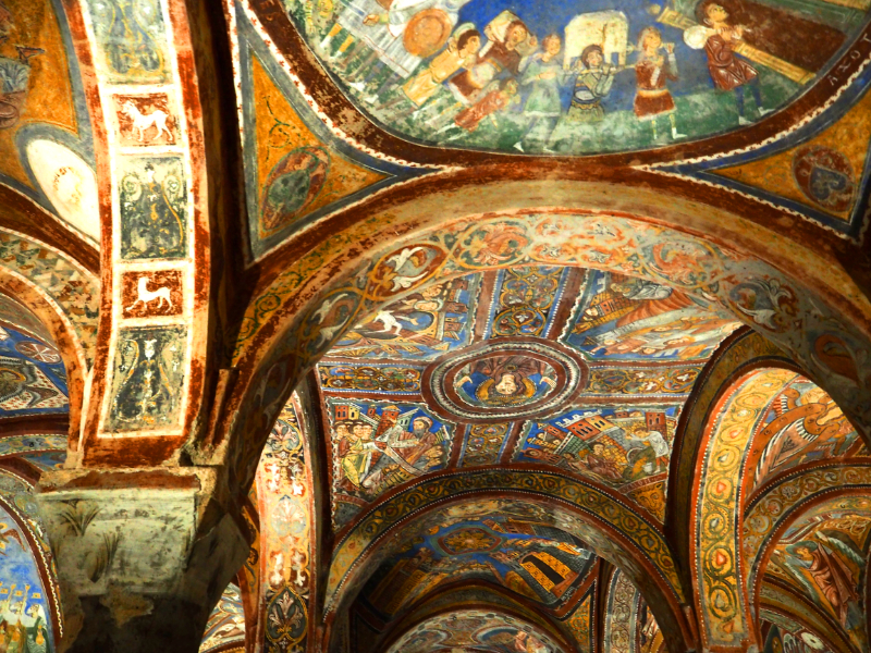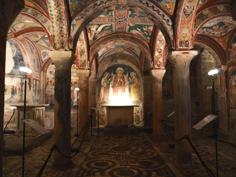Nella Piazza principale si erge la Cattedrale di Santa Maria. Costruita nel XII secolo in stile romanico, ha la particolarità di avere il campanile completamente staccato dal corpo centrale. L’interno è impreziosito da un pavimento cosmatesco che risale al 1230. Ma è nei suoi sotterranei che è custodito il vero tesoro della chiesa: la Critpa di San Magno. Con oltre 500 mq di affreschi medievali, è un luogo straordinario. Non è un caso che venga definita la Sistina del Duecento. Lascio la parola alle foto che ho scattato all’interno, che mostrano la bellezza degli affreschi che rivestono pareti e soffitto.